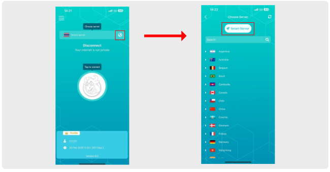 - ถ้าอยากเลือกประเทศเอง ให้กดที่ไอคอนรูปโลกหรือเมนูเซิร์ฟเวอร์